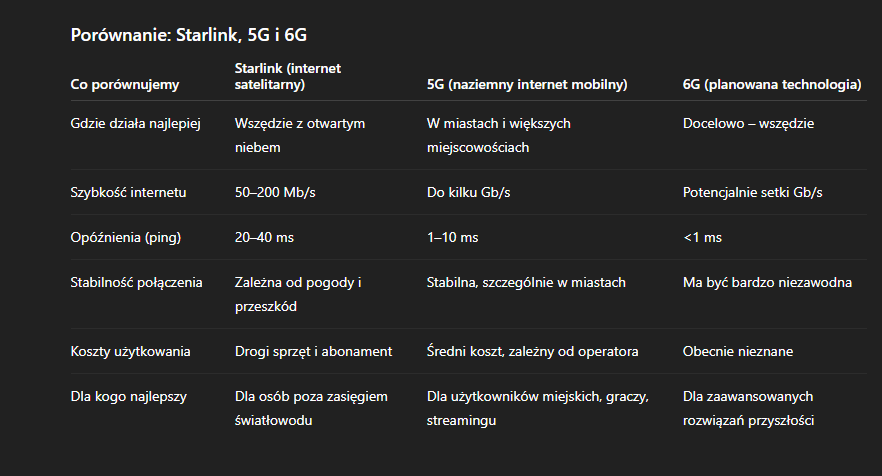 Starlink to internet satelitarny od SpaceX, który działa dzięki satelitom na niskiej orbicie. Nie jest to klasyczna sieć 5G, ale może współpracować z 5G, na przykład jako dodatkowe łącze tam, gdzie tradycyjny internet jest słaby. Co do 6G – to dopiero przyszłość, która ma się pojawić za kilka lat. Starlink może wtedy pomóc w zapewnieniu szybkiego internetu praktycznie wszędzie, dzięki swojej satelitarnej sieci.